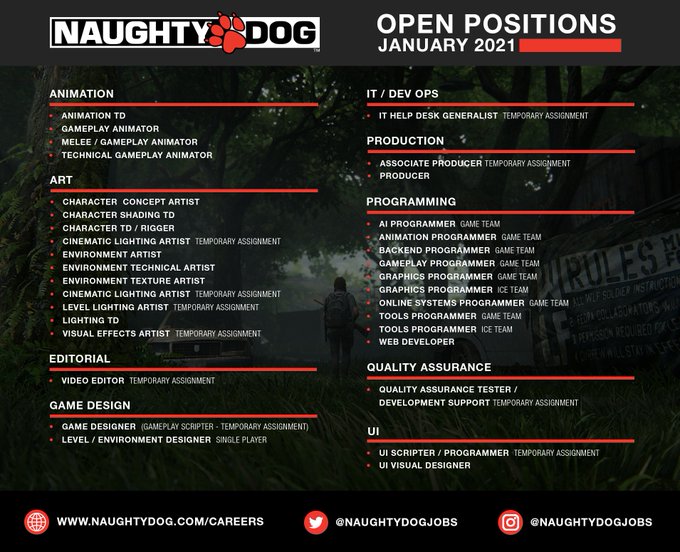 Para pessoas que estão procurando emprego, a Naugthty Dog está dando oportunidade para desenvolvedores talentosos como animadores, programadores, artistas e editores de vídeos.